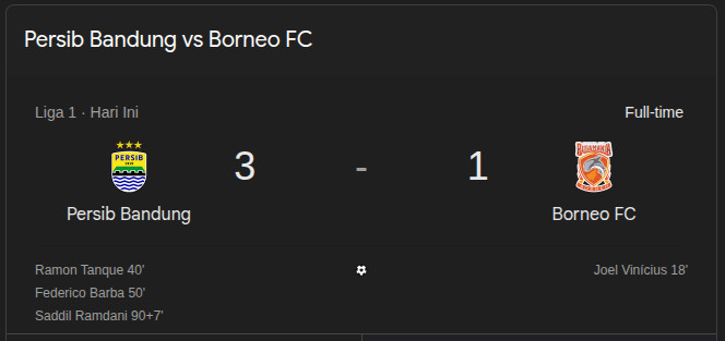 Di penghujung injury time, Persib memastikan tiga poin lewat gol Saddil Ramdani. Berawal dari kelengahan lini belakang Borneo, Saddil menerima umpan terobosan dari Uilliam dan dengan tenang menceploskan bola ke gawang, mengunci kemenangan Persib menjadi 3-1.